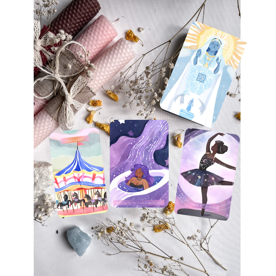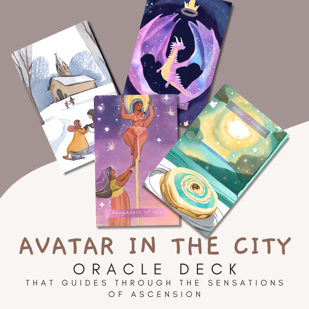 This is an Oracle Deck made by the Feminine Mystical Shaman Aya Bellene. The Origins of the Avatar starts on the back of deck, the avatar is incarnated from Divine Oneness. And who they really are and from is depicted by the very large ancient being that is always watching over them on their journey. The journey of the avatar tells a non-linear story of the human being becoming aware of their origins while living as human in modern society. As you remember who you are, you will shed and forgive what no longer serves you, and learn that you can trust in your higher self, gifts, talents, in an ever expanding cycle. Purchase the Deck and Download the Audio/Text by clicking on the QR code on the back of each card.